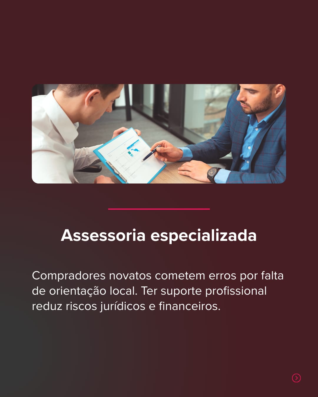 Auxilio clientes e investidores a tomar decisões seguras, conscientes e alinhadas aos seus objetivos de patrimônio e estilo de vida. Ao mesmo tempo, compartilho técnicas de venda, posicionamento e alinhamento profissional que ajudam corretores de imóveis a elevar sua comunicação, gerar mais confiança e atuar com mais clareza no mercado internacional.